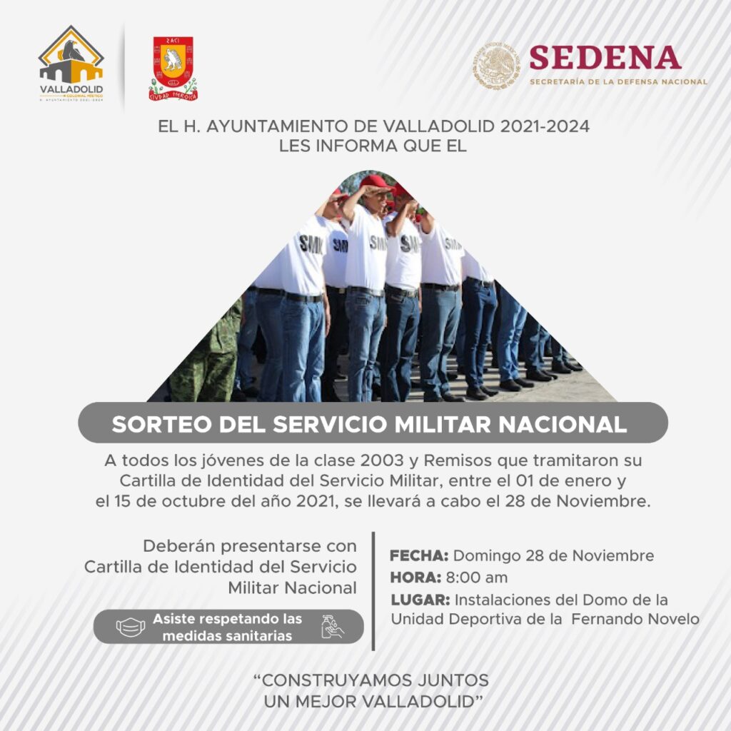 Valladolid, Yucatán, 24 de noviembre de 2021.- El Ayuntamiento en coordinación con la Secretaría de la Defensa Nacional, llevarán a cabo el próximo domingo 28 de noviembre el sorteo del Servicio Militar Nacional.