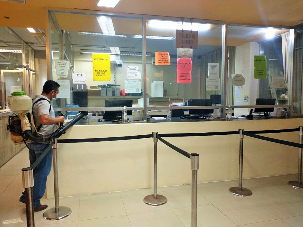 Desde los primeros días del mes de enero de este año, el Poder Judicial ha redoblado sus jornadas de desinfección e integró una nueva cuadrilla para reforzar estos trabajos que son fundamentales como medidas preventivas para servidores y servidoras judiciales, pero también para los usuarios y usuarias del servicio de impartición de justicia.