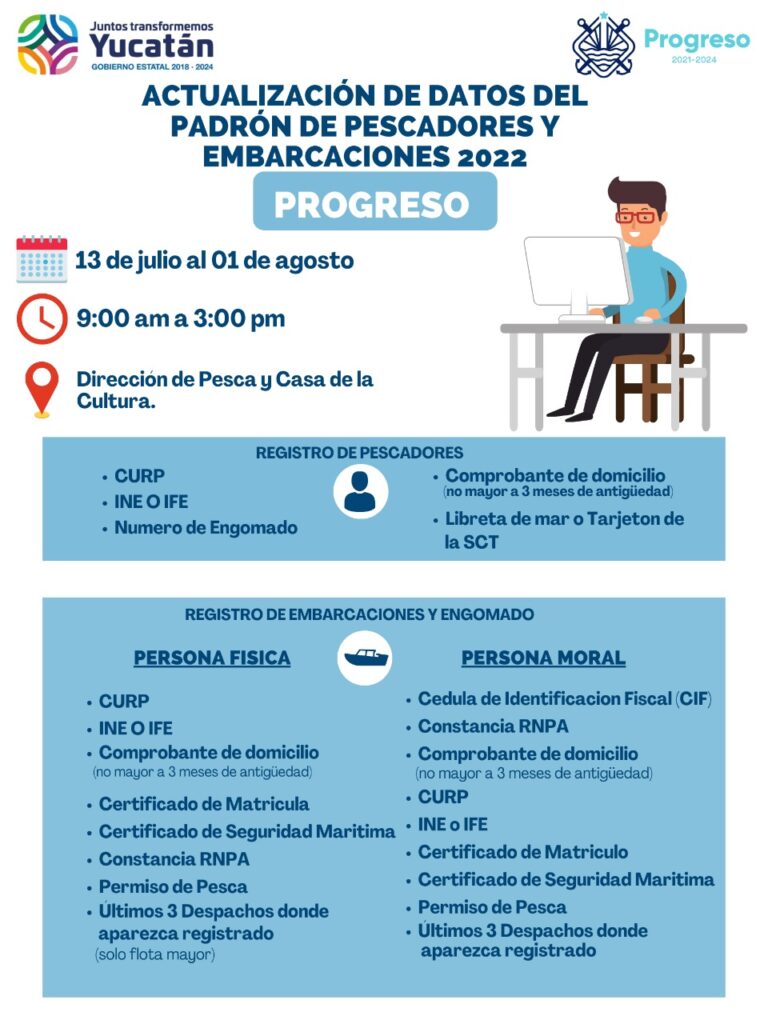 Progreso, 11 de julio del 2022. – El H. Ayuntamiento que preside el alcalde Julián Zacarías Curi, a través de la Dirección de Pesca invita a participar en la actualización de datos del padrón de pescadores y embarcaciones.