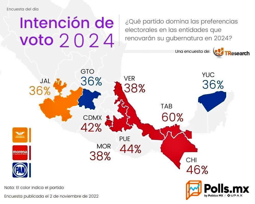 Mientras el PAN, además de Yucatán ganaría la elección en Guanajuato y Movimiento Ciudadano Jalisco, con 36%.
