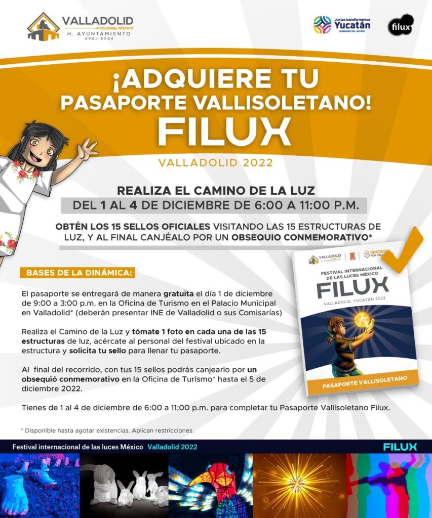 Realizado por primera vez en Valladolid, el FILUX representará una experiencia única e inolvidable para las familias que asistan, pues quienes así lo hagan podrán llevarse un obsequio a través de la dinámica denominada “Pasaporte Vallisoletano”, el cual estará disponible para los vallisoletanos a partir de mañana, de 9:00 a.m. a 3:00 p.m., en la oficina de turismo del Ayuntamiento.