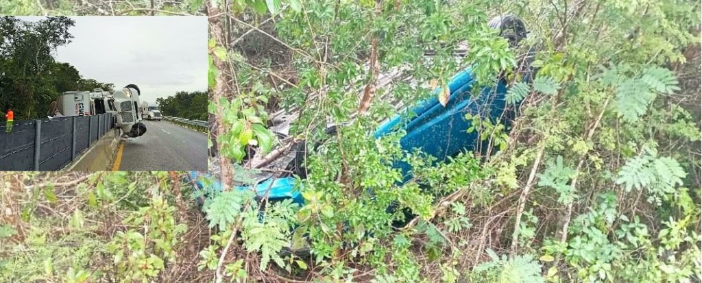 Asimismo en el kilómetro 196  de la  autopista Mérida-Cancún, un tractocamion de caja cerrada placas del servicio Público federal de una empresa de paquetería y mudanzas terminó volcada.