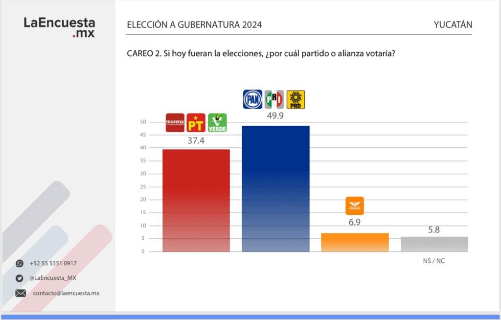 Las encuestadoras coinciden también en que una alianza PAN-PRI-PRD aumenta las posibilidades de ganar del alcalde meridano y una de ellas, LaEncuesta.Mx, considera incluso que la ventaja como bloque sería de 12.5 puntos frente a Morena, en lo que sería prácticamente inalcanzable.