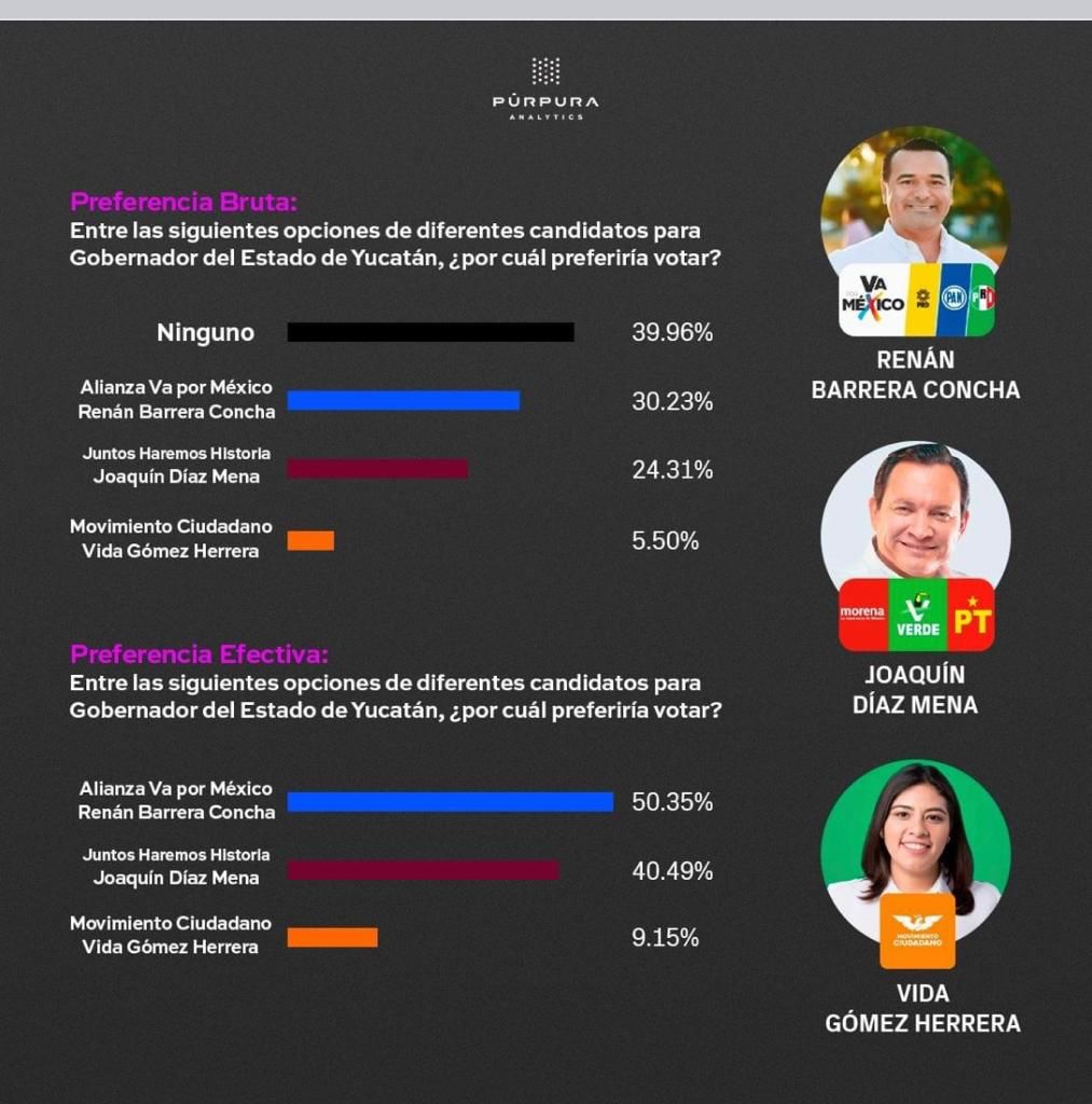Púrpura dice que en “preferencia efectiva”, la ventaja del posible bloque PAN-PRI-PRD, con Renán a la cabeza, es del 50.35%, contra el 40.49% de Morena-PT-PVEM, lo que arroja una diferencia de casi 10 puntos.