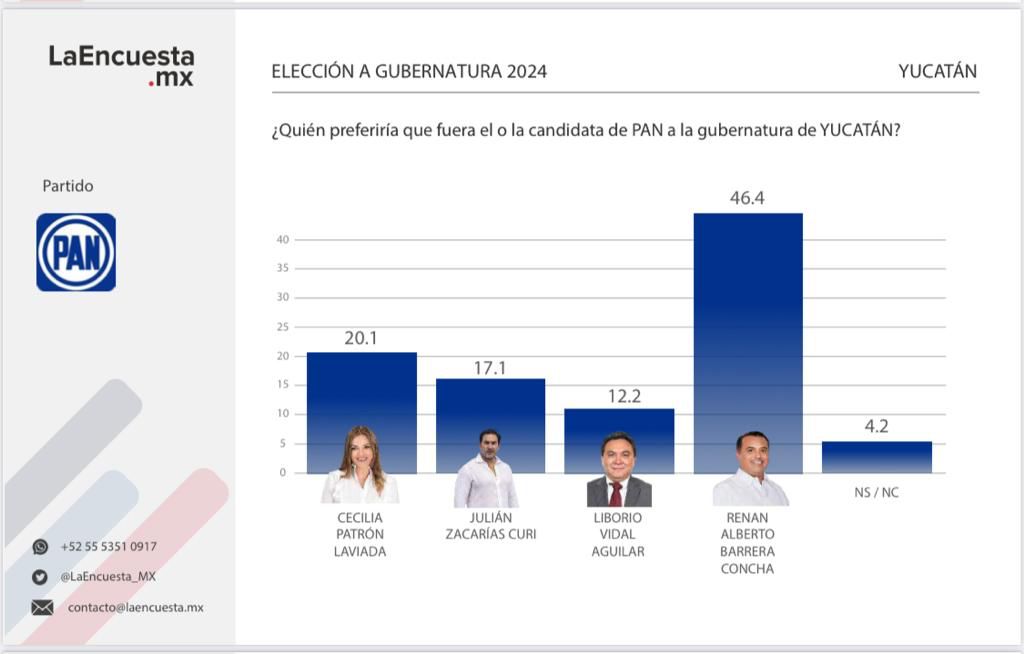 -LaEncuesta.Mx afirma que el 46.4%de los entrevistados prefiere a Renán Barrera como el candidato del PAN a la gubernatura; por partidos el 38.3 votaría por el PAN, frente al 33.5 por Morena (una ventaja de 4.8 puntos), pero un 49.9% de los electores votaría por la alianza PAN-PRI-PRD, contra el 37.4% del bloque Morena-PT-PVEM, lo que significa que la ventaja sería mucho mayor y prácticamente inalcanzable (12.5 puntos).