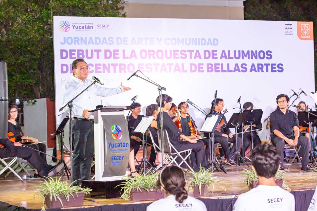Mérida, Yucatán, a 29 de mayo de 2023.- Para ofrecer oportunidades de desenvolvimiento escénico y desarrollo artístico para las y los alumnos del Centro Estatal de Bellas Artes, el titular de la Secretaría de Educación del Gobierno de Estado, Liborio Vidal Aguilar atestiguó el debut de la primera orquesta de estudiantes de dicha institución.