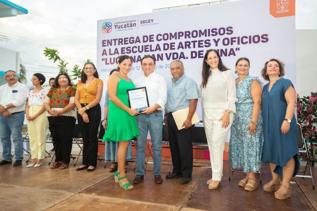 Mérida, Yucatán a 13 de junio de 2023.- Para cumplir con los compromisos adquiridos con docentes y alumnos de la Escuela de Artes y Oficios “Luciana Kan viuda de Luna”, para continuar con la formación integral e inserción laboral de jóvenes y adultos, el secretario de Educación, Liborio Vidal Aguilar hizo entrega de herramientas y material para el desarrollo de las especialidades que se imparten, así como acciones de mantenimiento y rehabilitación del edificio, que incluyó la pintura general, iluminación, colocación de malla ciclónica, bomba de agua, rehabilitación de baños y mejora del piso.