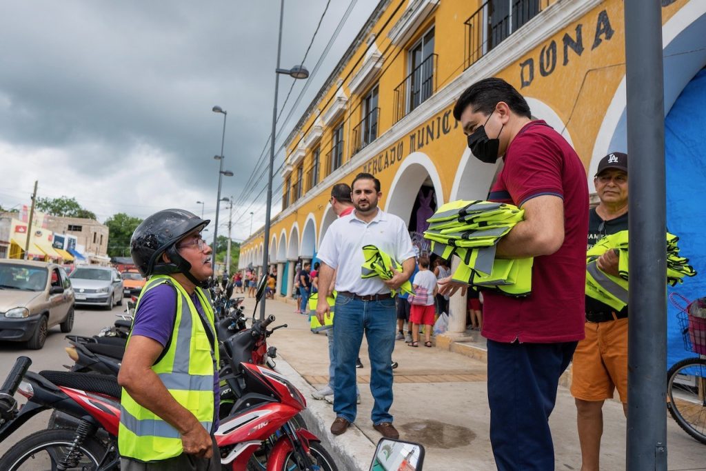 Valladolid, Yucatán, a 28 de agosto de 2023.- Integrantes de la Asociación de Restaurantes de Valladolid repartieron de manera gratuita chalecos de seguridad de alta visibilidad en el Mercado Municipal y en el periférico de la ciudad con salida a Chichimilá.