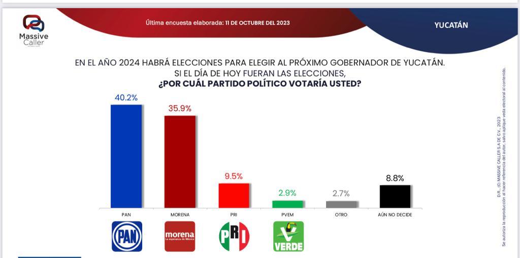 La más reciente encuesta de Massive Caller reafirma a Renán Barrera y al PAN como punteros en la intención del voto ciudadano rumbo a la gubernatura de Yucatán en 2024, en una ventaja consistente que se ha mantenido desde hace meses.