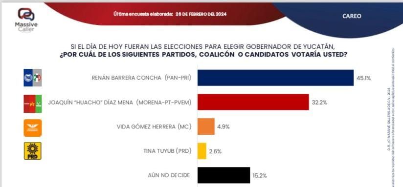 De acuerdo con la más reciente encuesta de intención de voto realizada por Massive Caller, Renán Barrera Concha, candidato del PAN, PRI y PANAL ocupa el primer lugar con un 45.1% de preferencia electoral, mientras que en segundo lugar se encuentra Huacho Díaz Mena, candidato de Morena, PT y PVEM, con un 32.2%.Según estos datos, la diferencia porcentual entre los dos candidatos principales es del 12.9%, lo que significa que el margen de ventaja para el panista va en aumento.