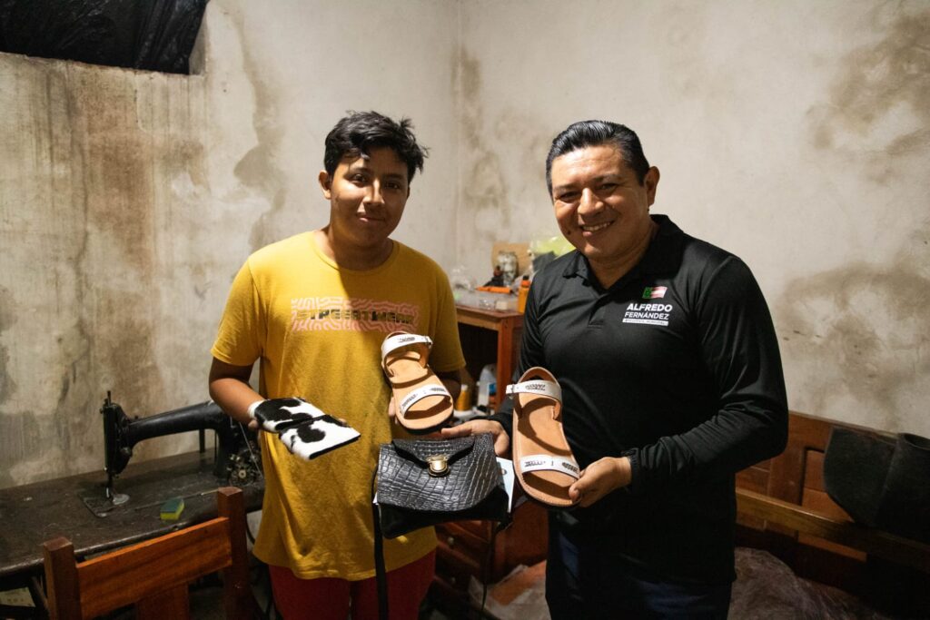 En amena plática con el joven, Alfredo Fernández lo felicitó por sus ganas de salir adelante y por el talento que tiene para elaborar los zapatos, bolsas, carteras, cinturones y chanclas de piel que vende.